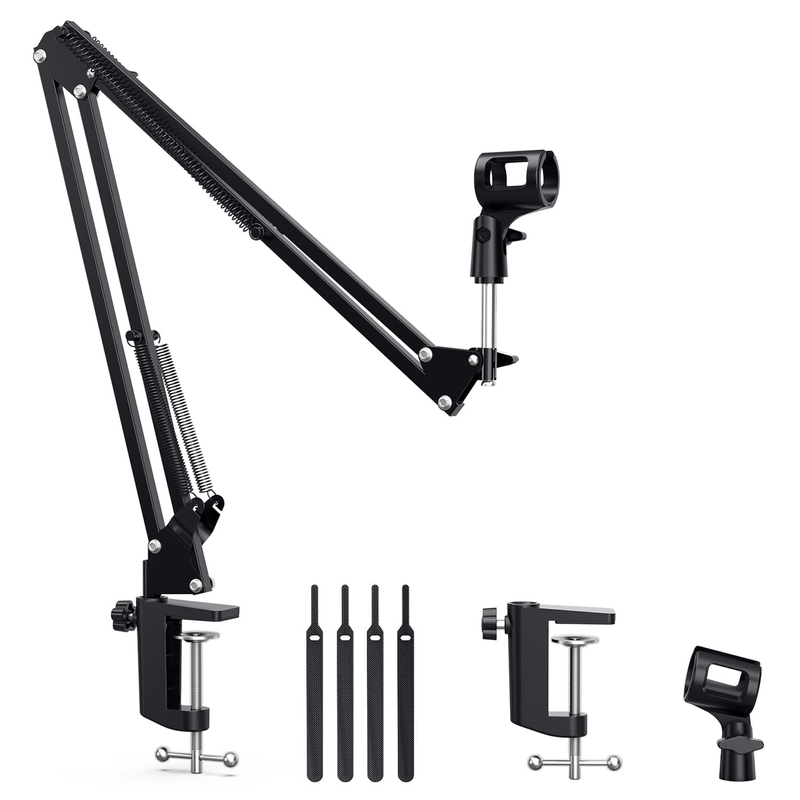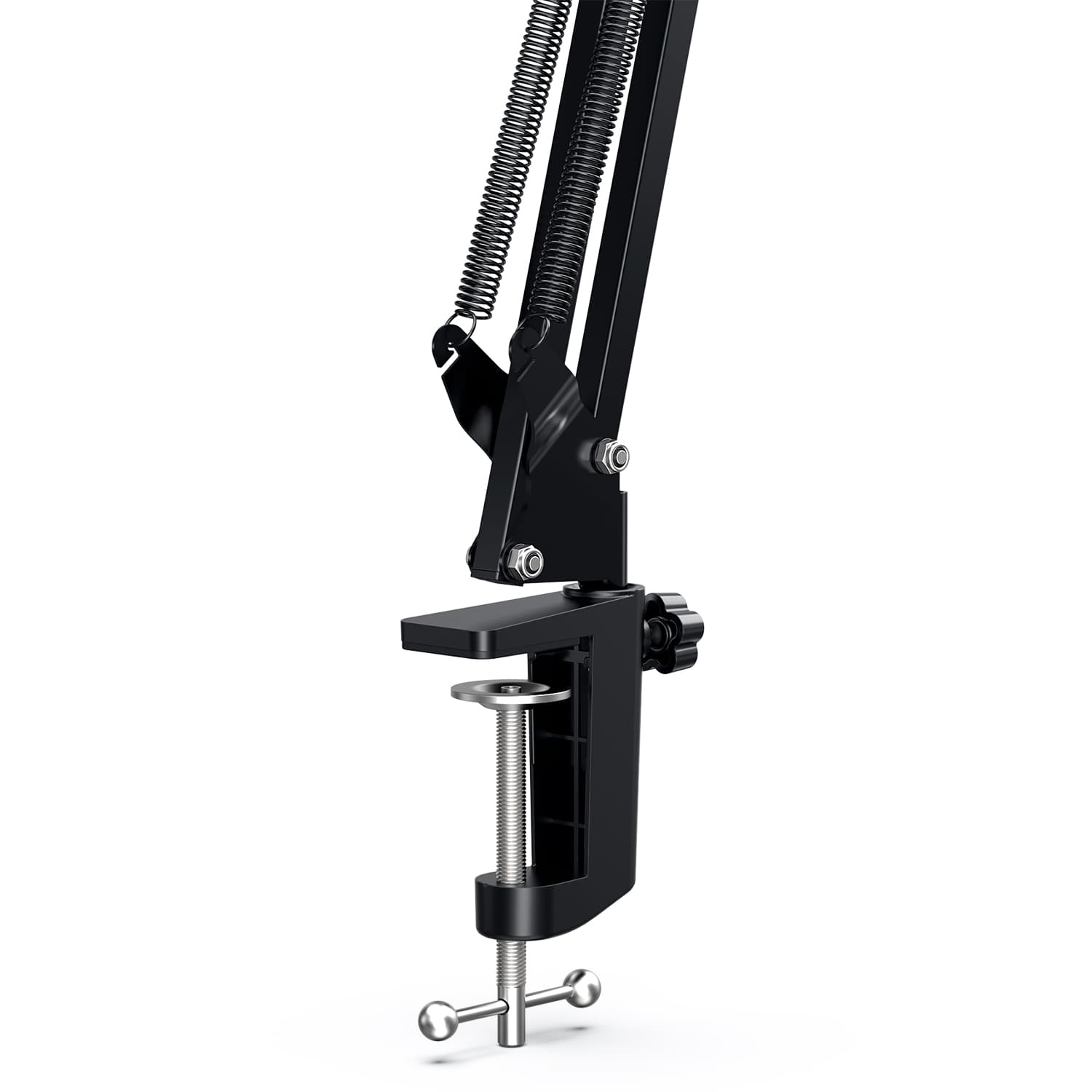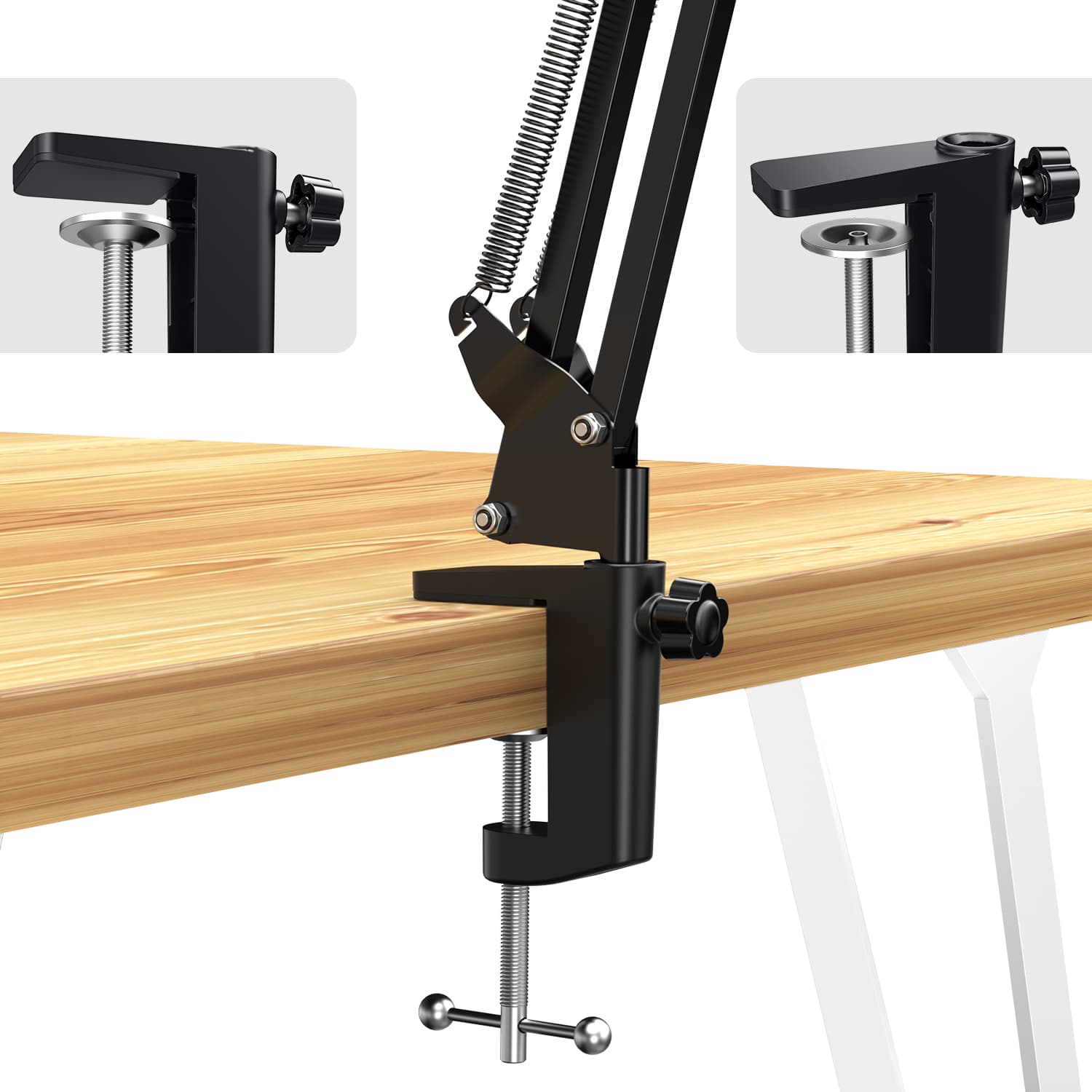 UPGRADED DESK CLAMP: – The desk clamp has 4 times larger contact area (38cm^2) and easily clips to any desk up to 6cm thickness. Standard 3/8″ to 5/8″ adapter for different shock mounts and microphones included. (Note: The microphone and shock mount are not included.)